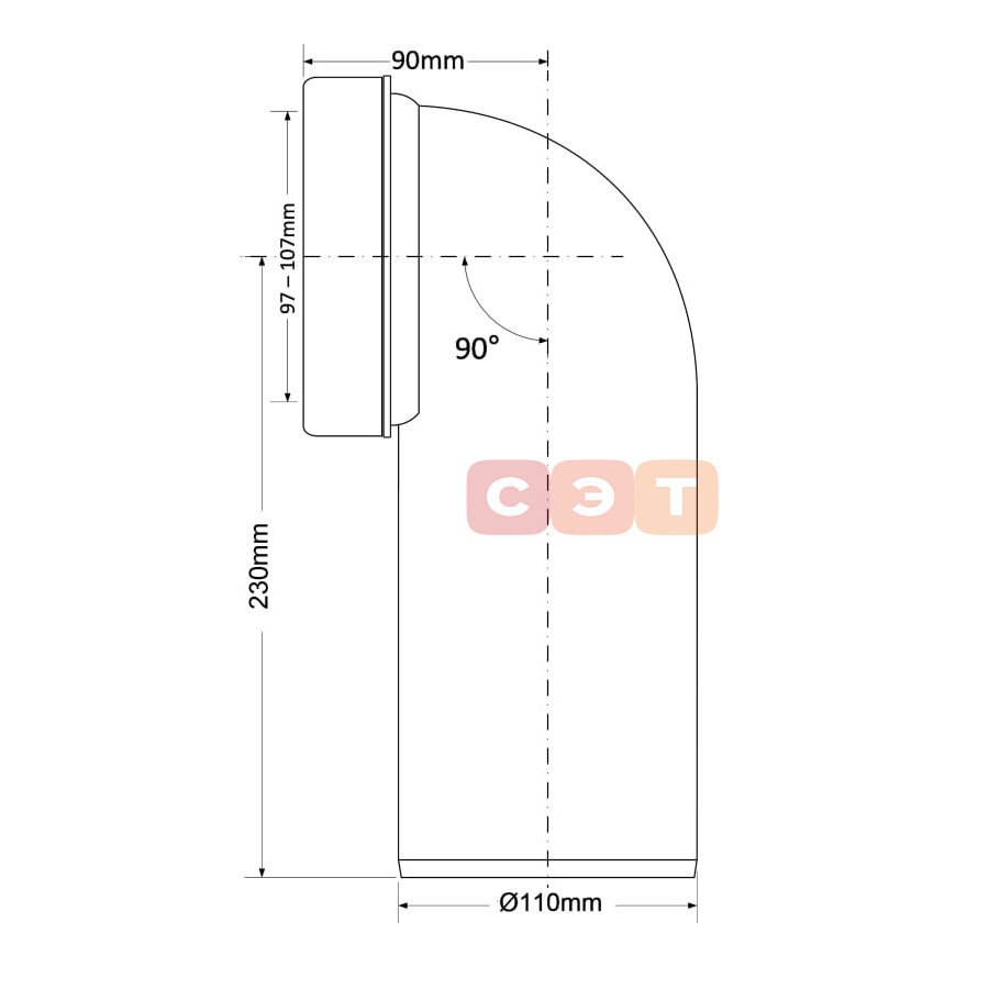 Труба фановая L=230 мм 90°, вход 97-107 мм, выход 110 мм