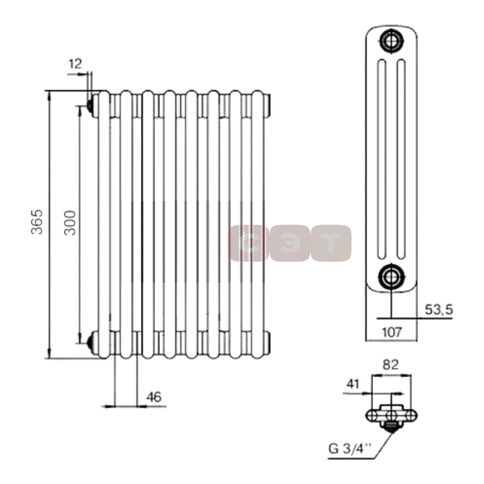 Высота радиатора составляет 570 мм, что делает его идеальным выбором для помещений с ограниченным пространством. Подключение к системе отопления осуществляется через боковые отверстия, что упрощает процесс монтажа.